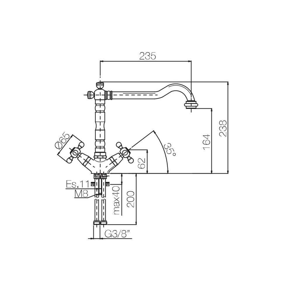 Robinet d'évier Porta&Bini à 2 leviers série Old Fashion avec bec pivotant, boutons rétro vintage, couleur cuivre 62570RA